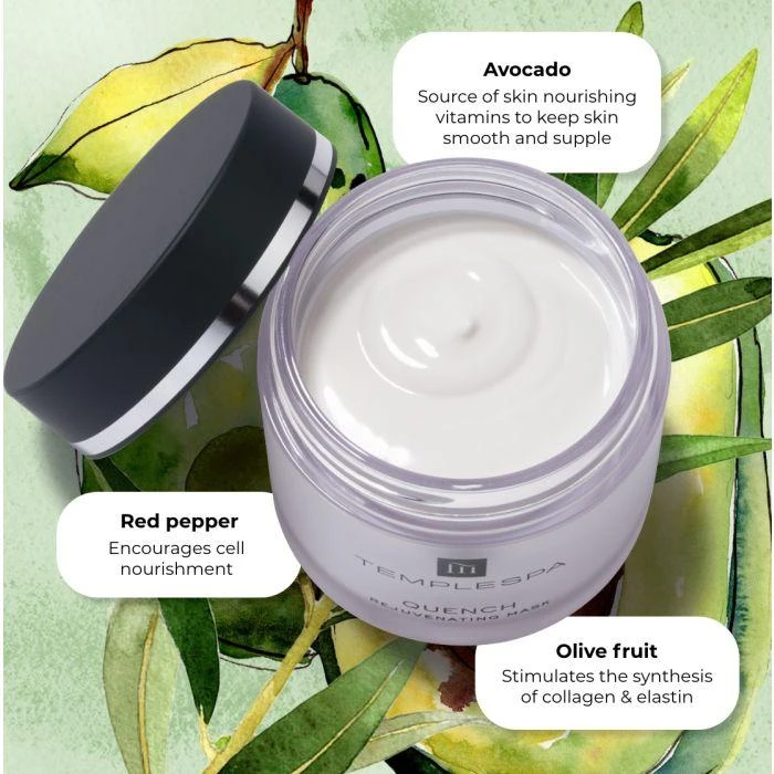 No surprises – this luxurious, rejuvenating mask is like a drink for the skin, literally saturating it with goodness. QUENCH has a rich texture and nutritious formula packed with Mediterranean ingredients of avocado, blackberry, red pepper, grapeseed, horse chestnut and olive, plus Phirmadermâ„¢ complex and echinacea. Plump, soft & radiant.