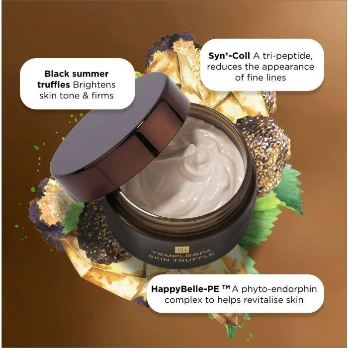 This ultimate rejuvenating facial moisturiser brings instant hydration, radiance and lustre as well as powerful anti-ageing goodness. Five years in the making by a crème de la crème team of skincare specialists in the field of derma-science in Switzerland, this unique formula utilises the very latest in peptide technology along with a fusion of natural actives that will bring immediate as well as long term results. It’s a recipe of all things associated with celebration – black summer truffles, champagne, diamonds, strawberries, chocolate, gold & silk, combined with skin boosting peptides to help reduce the appearance of lines and deep wrinkles. Finally we’ve added the really clever HappyBelle-PE, to help revitalise your skin with a radiant glow, and so that’s why we call Skin Truffle ‘happiness in a jar’!