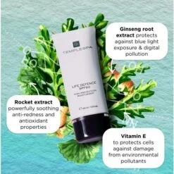 With UVA/UVB broad-spectrum protection SPF50, plus a potent antioxidant complex of rocket, ginseng root, vitamin E and sodium hyaluronate. These clever ingredients create a barrier against the sun and skin-damaging free radicals, city pollution, air con, high energy visible blue light from digital devices and daily skin stress.