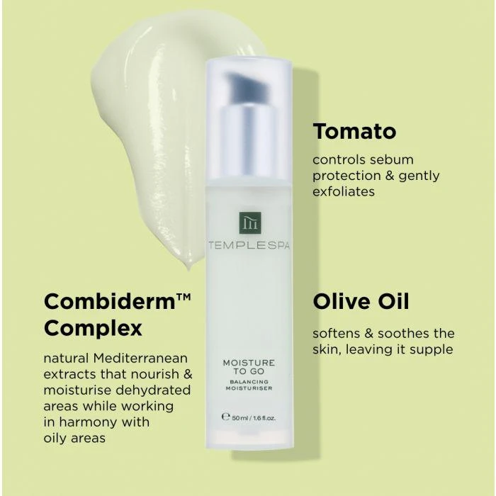 Clever. Advanced. A texture like pure velvet and well-behaved on both oily and dry areas of your split personality skin! Mediterranean ingredients of tomato, grapefruit, marjoram, wild yam and olive combine with vitamins and our high performance Combidermâ„¢ complex to bring balance – absorbing excess oil and rehydrating the drier areas at the same time. We actually think MOISTURE TO GO might just be telepathic!